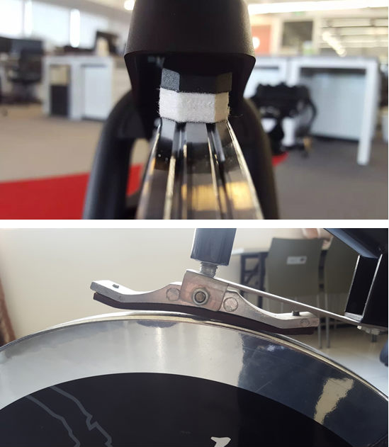 摩擦式阻力调节一般是利用羊毛毡或者牛皮通过摩擦来起到增加阻力的目的,这种调阻是家用常见的配置,成本较低,模拟性好,但是有比较大的声音,需要定期更换,顺畅度不是很好。